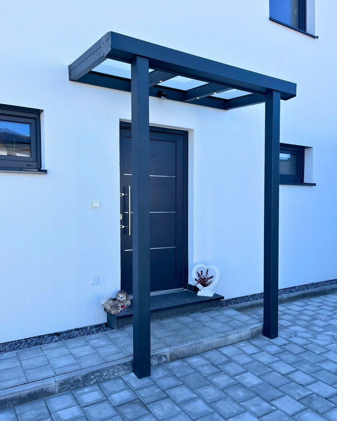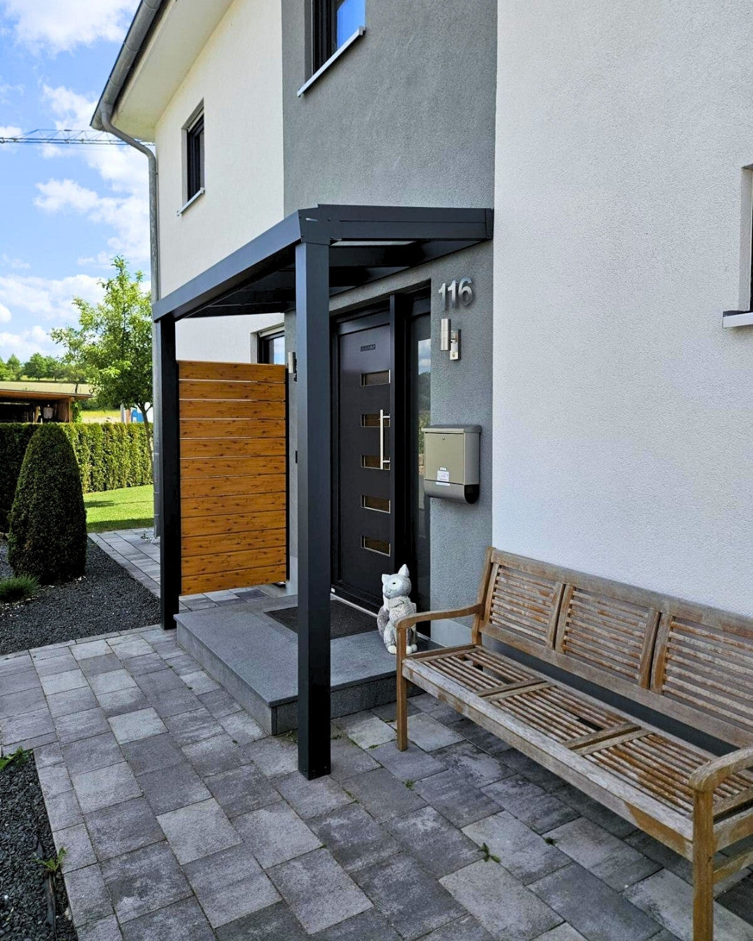 Schlicht, elegant und langlebig – diese Überdachung verwandelt Deinen Eingangsbereich in einen wetterbeständigen und stilvollen Ort.