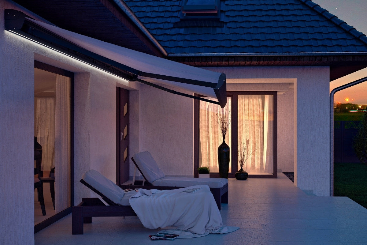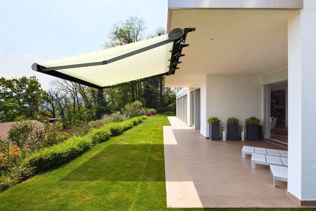Das UV-beständige Tuch bietet optimalen Sonnenschutz, während die einfache Bedienung per motorisierter Steuerung mit Fernbedienung für Komfort sorgt.