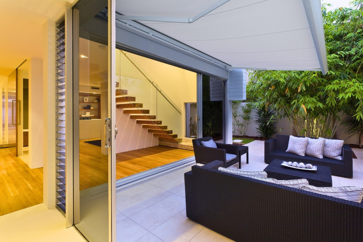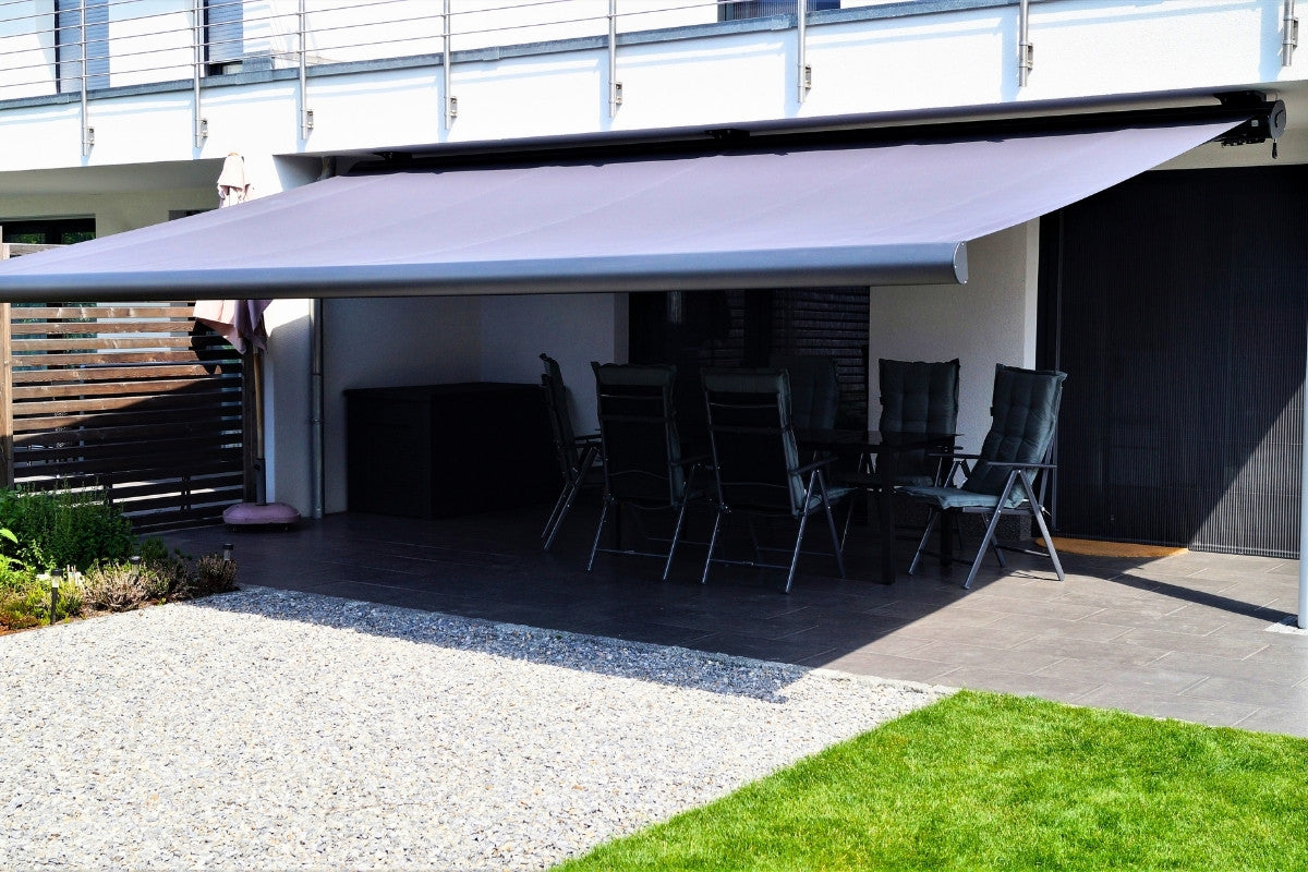 Wähle aus einer Vielzahl von Farben und Mustern für das UV-beständige Tuch. Der Antrieb ist wahlweise manuell, elektrisch mit Schalter, Funk oder Smart-Home-Integration.